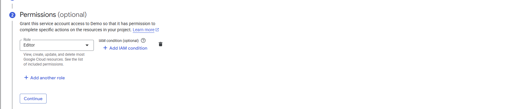 Choose a role for Service Account (Editor) and click "Continue".